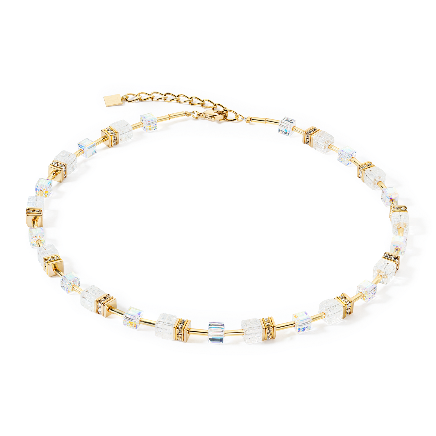 La collana GeoCUBE® Iconic Nature è un gioiello realizzato a mano con cristallo di rocca cracked e scintillanti cristalli Swarovski®. Questo capolavoro di gioielleria unisce le proprietà rilassanti del cristallo di rocca alle tonalità oro e cristallo: un gioiello elegante che celebra la bellezza della natura.