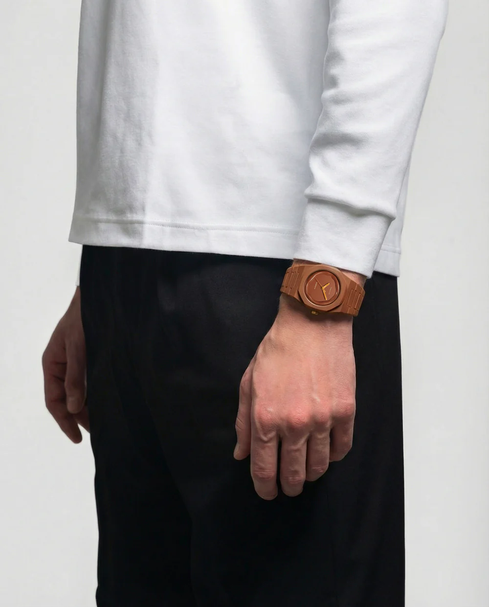 Realizzato interamente in policarbonato con una finitura bianca soft-touch, la cassa, la lunetta e il bracciale integrato sono decorati da sottili illustrazioni che tracciano la silhouette stessa dell’orologio.