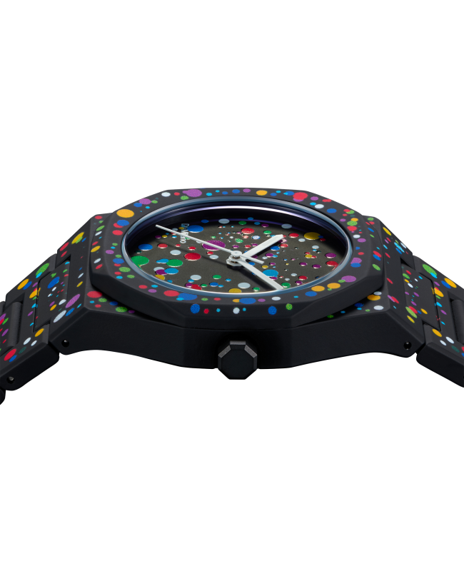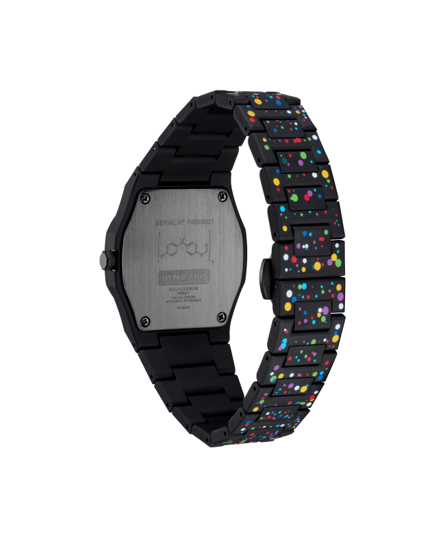 Il nuovo Poly Dot è ispirato al movimento espressionista astratto e, grazie alla famosa "tecnica del dripping" utilizzata dagli artisti del movimento, ci ha permesso di versare vernice liquida colorata sulla superficie in policarbonato dell'orologio, permettendoci di creare qualcosa di unico e artistico. L'oggetto di design è la nostra tela, sia nera che bianca, e il risultato finale è un prodotto che ti accompagnerà senza essere banale.
