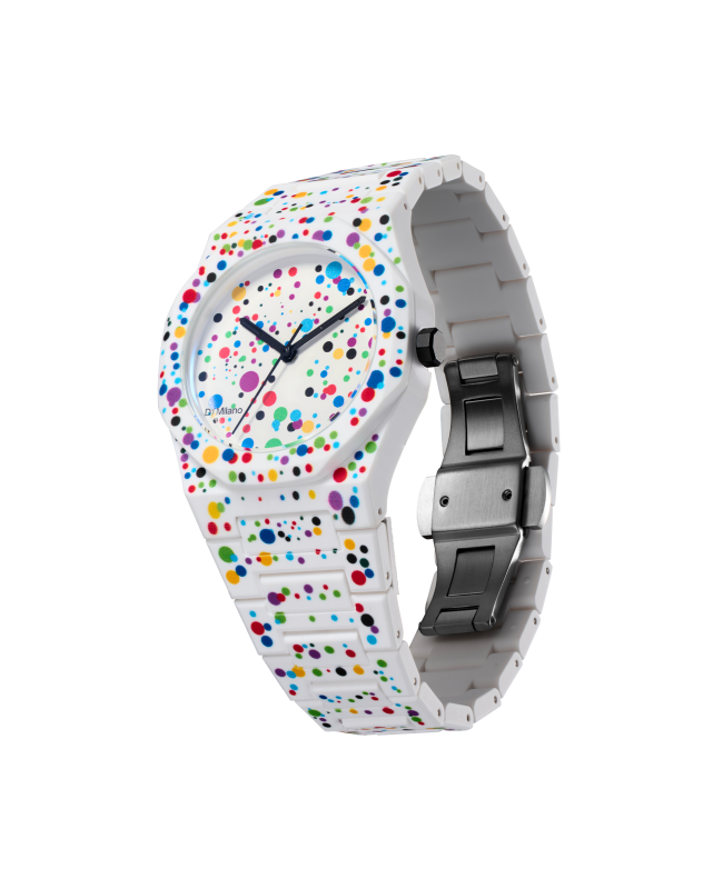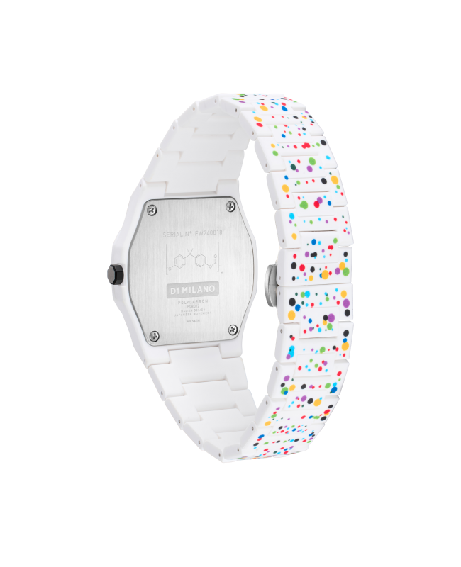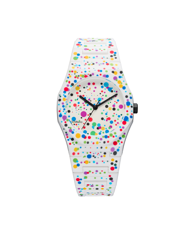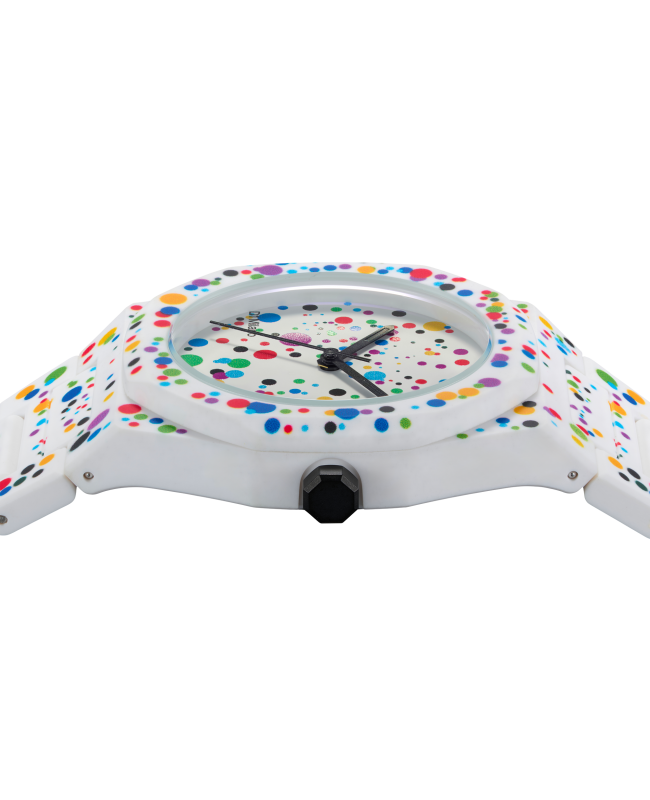 Il nuovo Poly Dot è ispirato al movimento espressionista astratto e, grazie alla famosa "tecnica del dripping" utilizzata dagli artisti del movimento, ci ha permesso di versare vernice liquida colorata sulla superficie in policarbonato dell'orologio, permettendoci di creare qualcosa di unico e artistico. L'oggetto di design è la nostra tela, sia nera che bianca, e il risultato finale è un prodotto che ti accompagnerà senza essere banale.