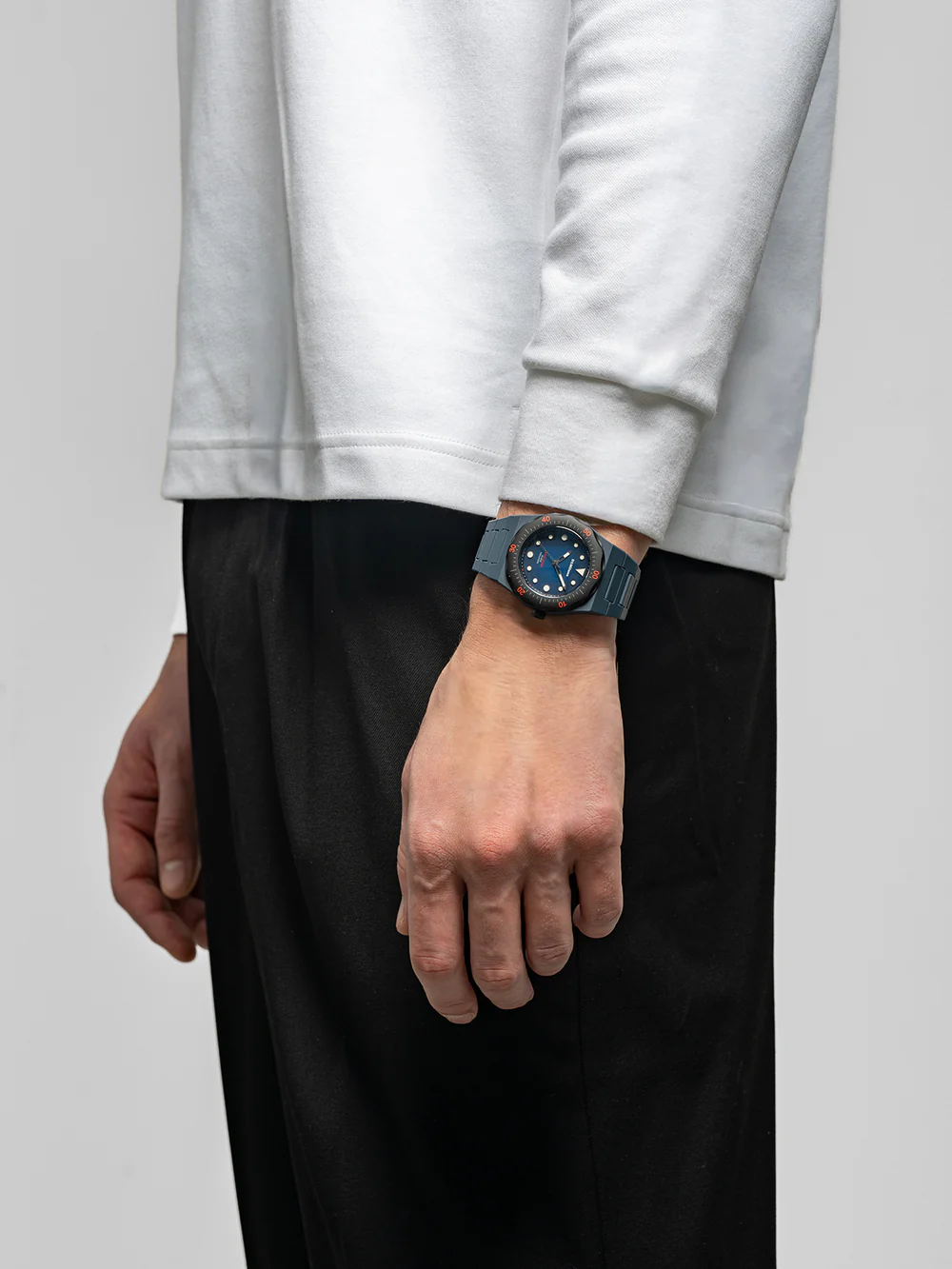 Realizzato interamente in policarbonato con una finitura bianca soft-touch, la cassa, la lunetta e il bracciale integrato sono decorati da sottili illustrazioni che tracciano la silhouette stessa dell’orologio.