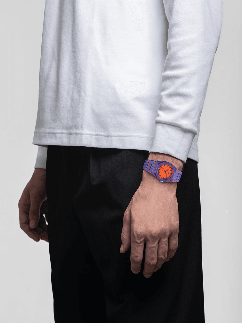 Realizzato interamente in policarbonato con una finitura bianca soft-touch, la cassa, la lunetta e il bracciale integrato sono decorati da sottili illustrazioni che tracciano la silhouette stessa dell’orologio.