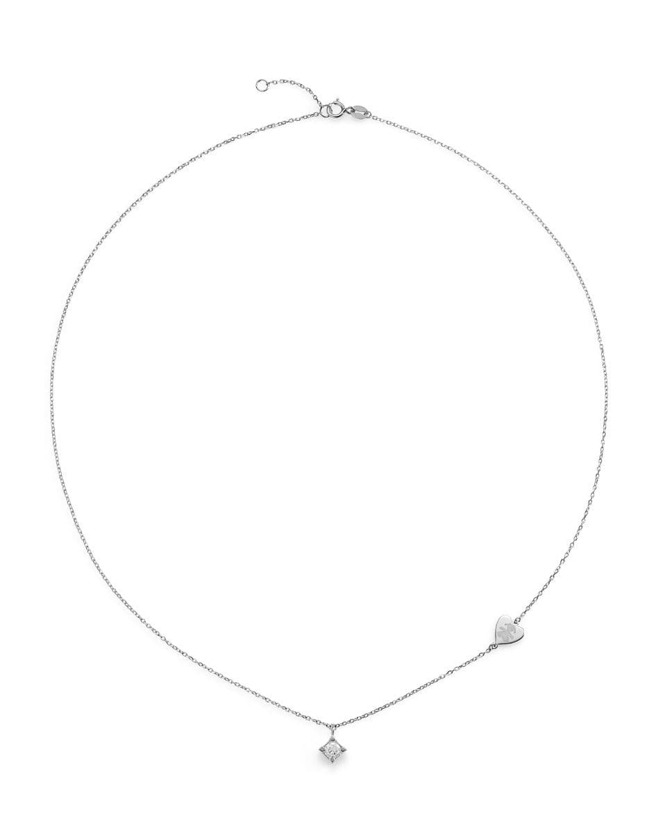 18kt white gold necklace with a 0.15ct diamond and heart-shaped tag featuring an engraved girl silhouette.