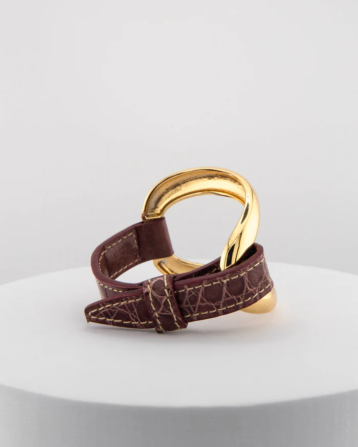 The MarriCortona Alligator bracelet is a handcrafted masterpiece made with great care and attention to detail. Its oval, rigid shape gives it timeless elegance, while the 18-karat gold-plated bronze microfusion adds a golden shine that spectacularly captures natural light. One of the distinctive features of this bracelet is the use of genuine crocodile leather. Made in Tuscany.