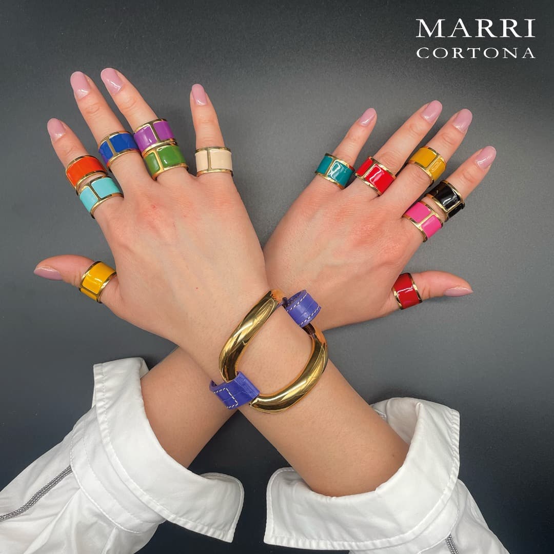Band-style, adjustable, the MarriCortona Enamel Rings are an explosion of light and color. The shine of 18-carat gold and enamel in a thousand hues. Handmade in Tuscany, in our workshop by the skilled hands of our artisans.