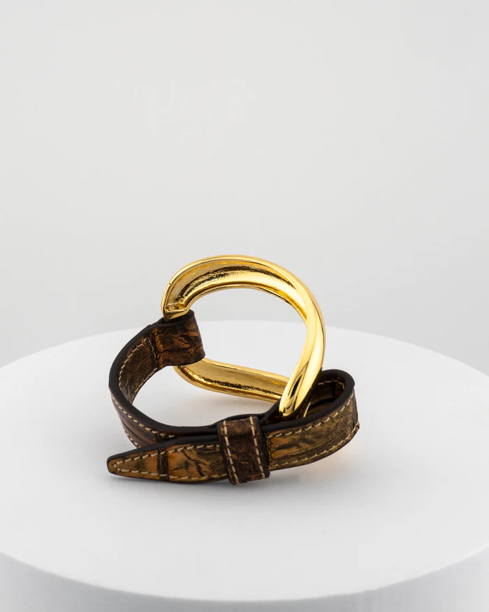 The MarriCortona Alligator bracelet is a handcrafted masterpiece made with great care and attention to detail. Its oval, rigid shape imparts timeless elegance, while the 18-carat gold-plated bronze microcasting provides a golden shimmer that spectacularly catches natural light. One of the distinctive features of this bracelet is the use of genuine crocodile leather. Made in Tuscany.