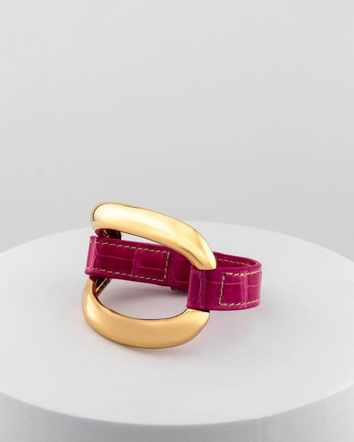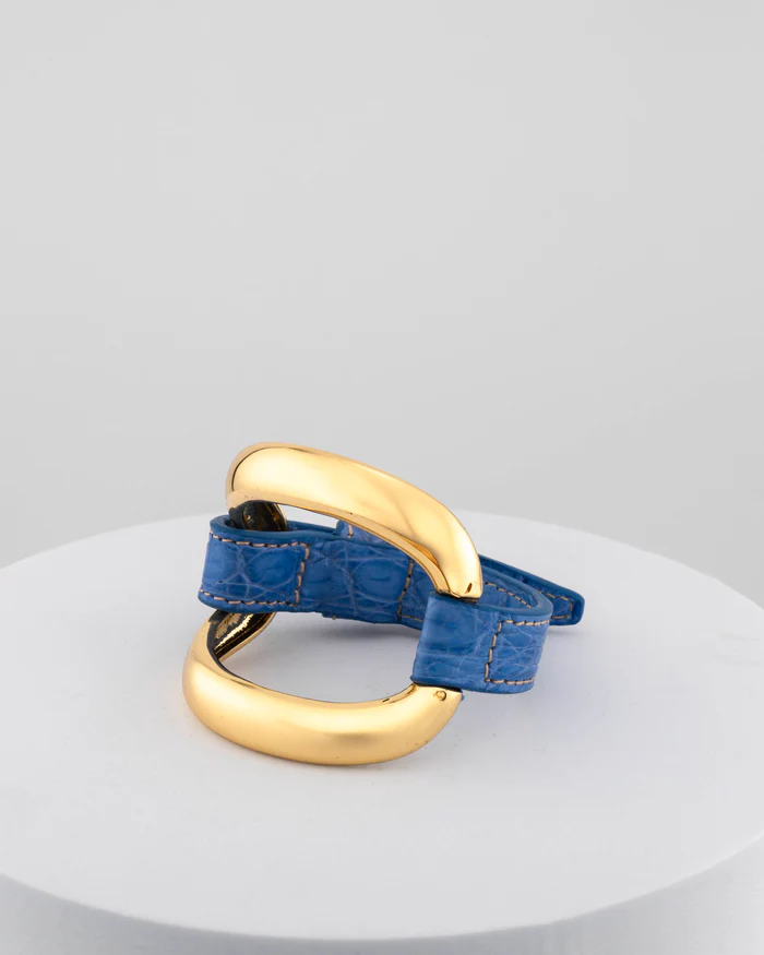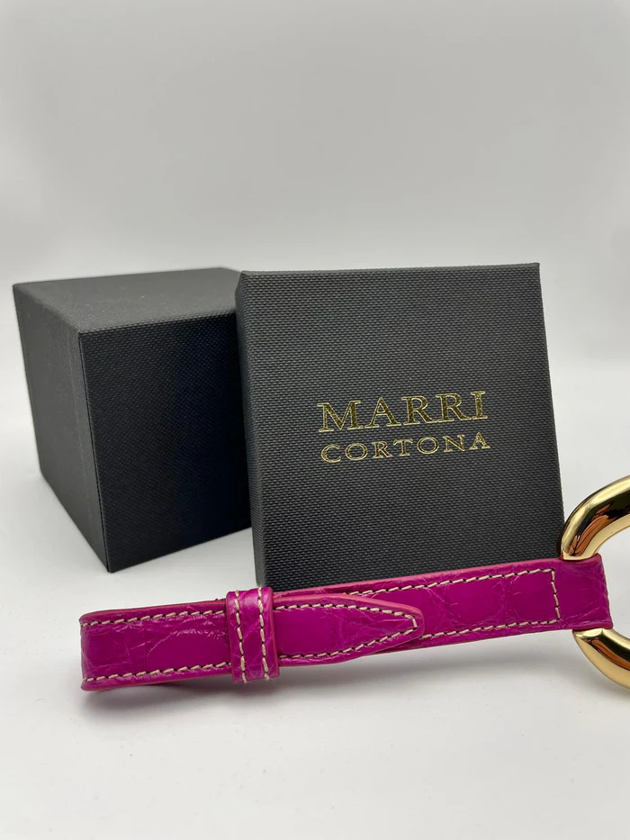 The MarriCortona Alligator bracelet is a handcrafted masterpiece created with great care and attention to detail. Its oval, rigid shape gives it timeless elegance, while the 18-carat gold-plated bronze microfusion adds a golden shimmer that spectacularly captures natural light. One of the distinctive features of this bracelet is the use of genuine crocodile leather. Made in Tuscany.