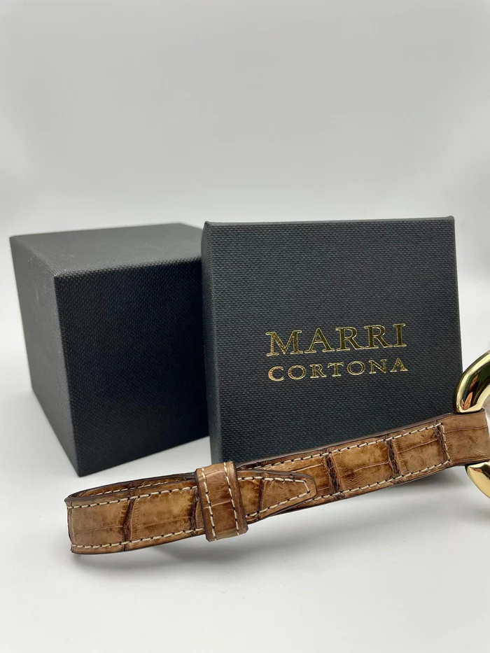 The MarriCortona Alligator bracelet is a handcrafted masterpiece made with great care and attention to detail. Its oval, rigid shape exudes timeless elegance, while the 18-carat gold-plated bronze microfusion adds a golden shimmer that spectacularly captures natural light. One of the distinctive features of this bracelet is the use of genuine crocodile leather. Made in Tuscany.