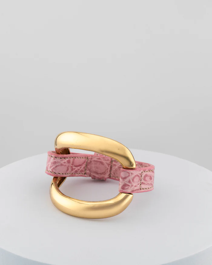 The MarriCortona Alligator bracelet is a handcrafted masterpiece made with great care and attention to detail. Its oval, rigid shape gives it timeless elegance, while the 18-carat gold-plated bronze microfusion provides a golden shimmer that spectacularly captures natural light. One of the distinctive features of this bracelet is the use of genuine crocodile leather. Made in Tuscany.