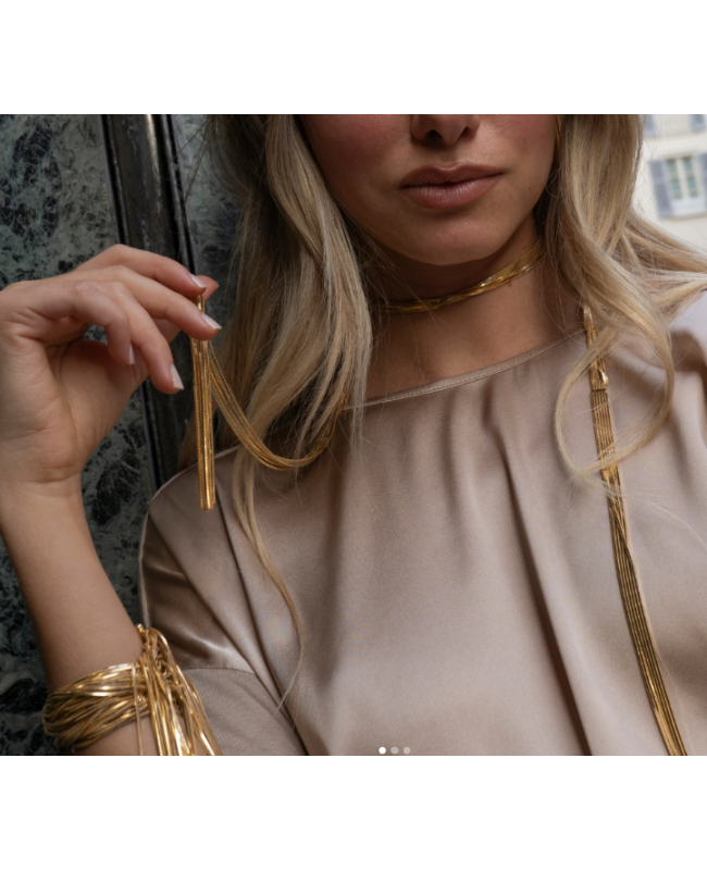 Some general guidelines to keep this product’s appearance and quality intact and unchanged: do not wear it while doing household chores; avoid contact with soaps, detergents, and cleaning products that could dull its shine; avoid wearing the item during sports activities. Contact with salt water, chlorinated water, or sweat is not recommended. Keep away from heat sources.