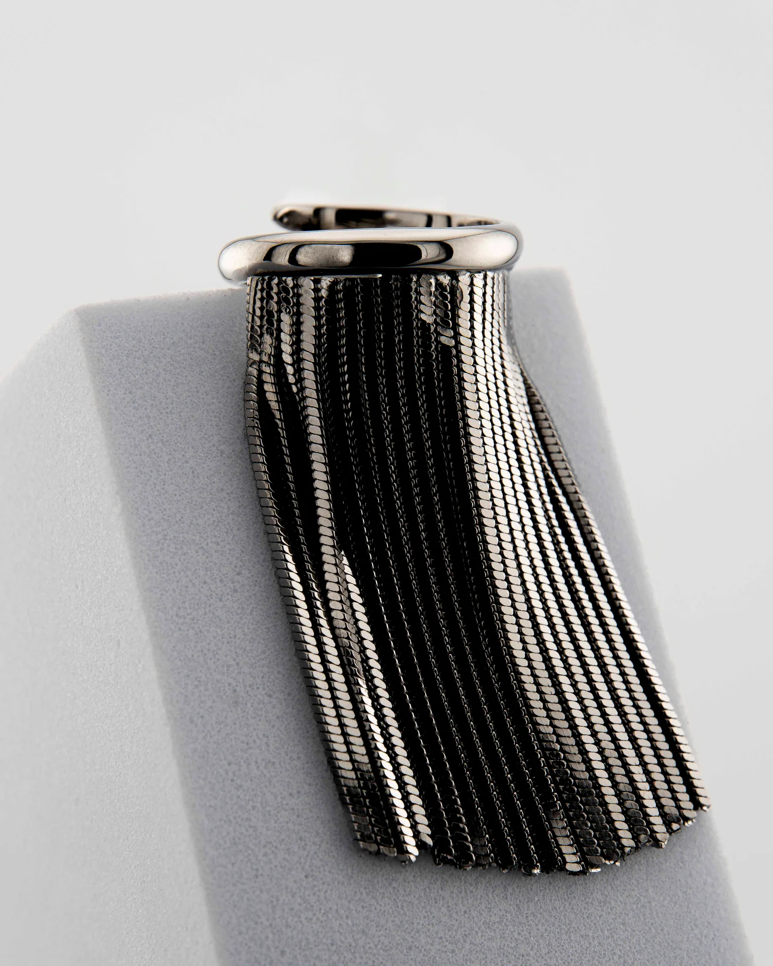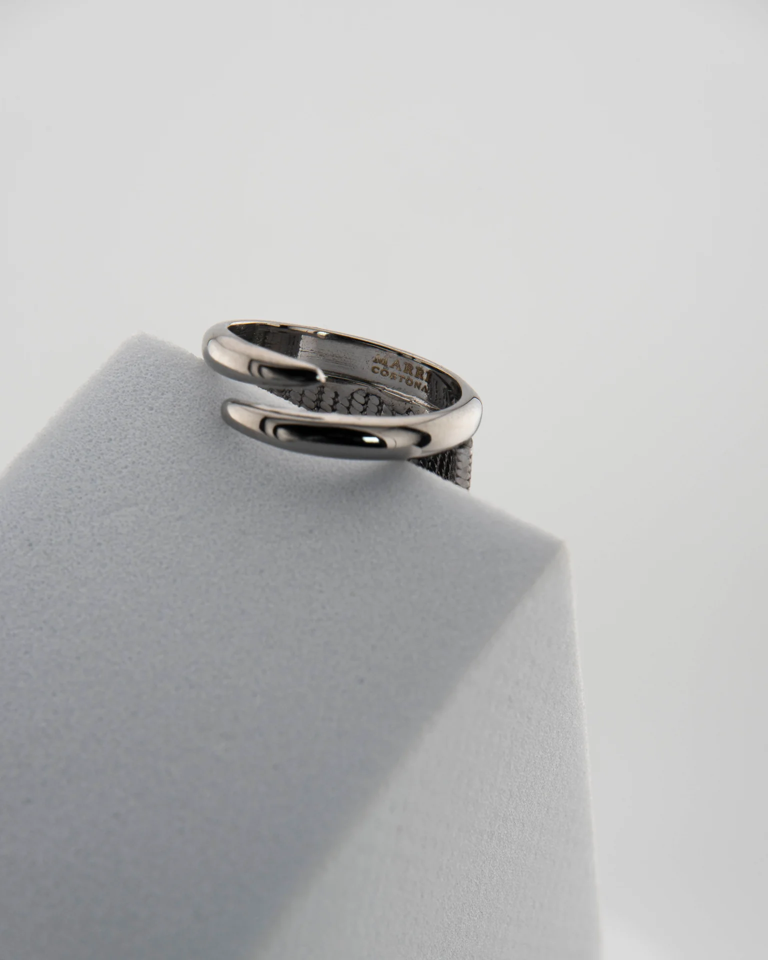 'Voila' Marri Cortona ring in white bronze with 18-carat gold plating, featuring fringes. The fringes dance and catch light and attention. A piece of jewelry that blends strength and grace, perfect for adding a touch of magic to any moment.