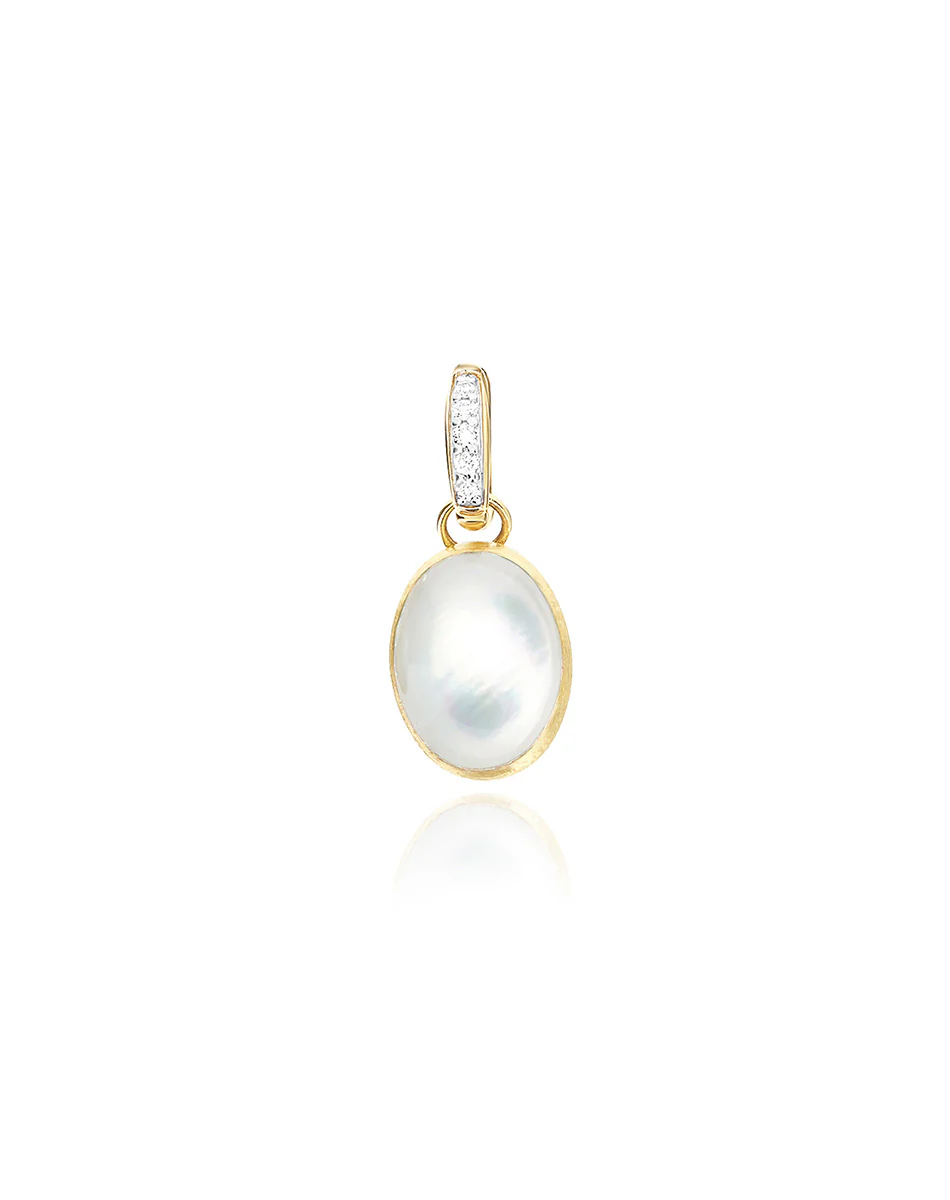 A summer night, the scent of warm air, the sky reflecting the moonlight. In the Dolcevita shade, mother-of-pearl meets the Boule — Nanis’ iconic shape — shimmering with iridescent reflections. An 18kt hand-engraved gold charm with a silky, embracing texture where rock crystal and mother-of-pearl intertwine in a composition celebrating light, material, and timeless beauty. A precious structure holds the perfect form and graceful curves of the Boule intact, preserving its fluid movement. Completing the charm is a diamond pavé clasp, a detail that enhances its versatility and allows for unique mixes, perfectly matching style and personality.