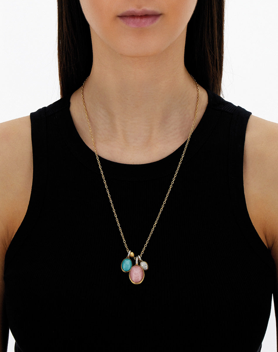 The Nanis charms, take on a rosy hue in this piece where 18kt gold and diamonds gently merge with a triplet of rock crystal, strawberry quartz, and mother-of-pearl, inspired by Rosolio. A small masterpiece of goldsmith artistry where nostalgia for the past meets the vibrancy of the present, creating an intense and lively jewel. Our advice? Play with the different colors and styles from the Ciliegine line to create your favorite combination.