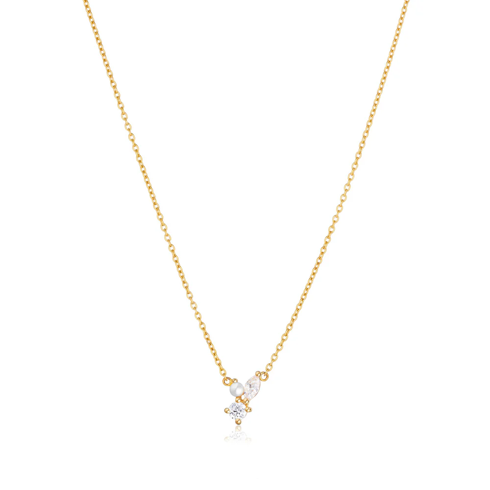 18k gold plated 925 sterling silver necklace, polished surface, set with faceted white cubic zirconia and a lustrous freshwater pearl