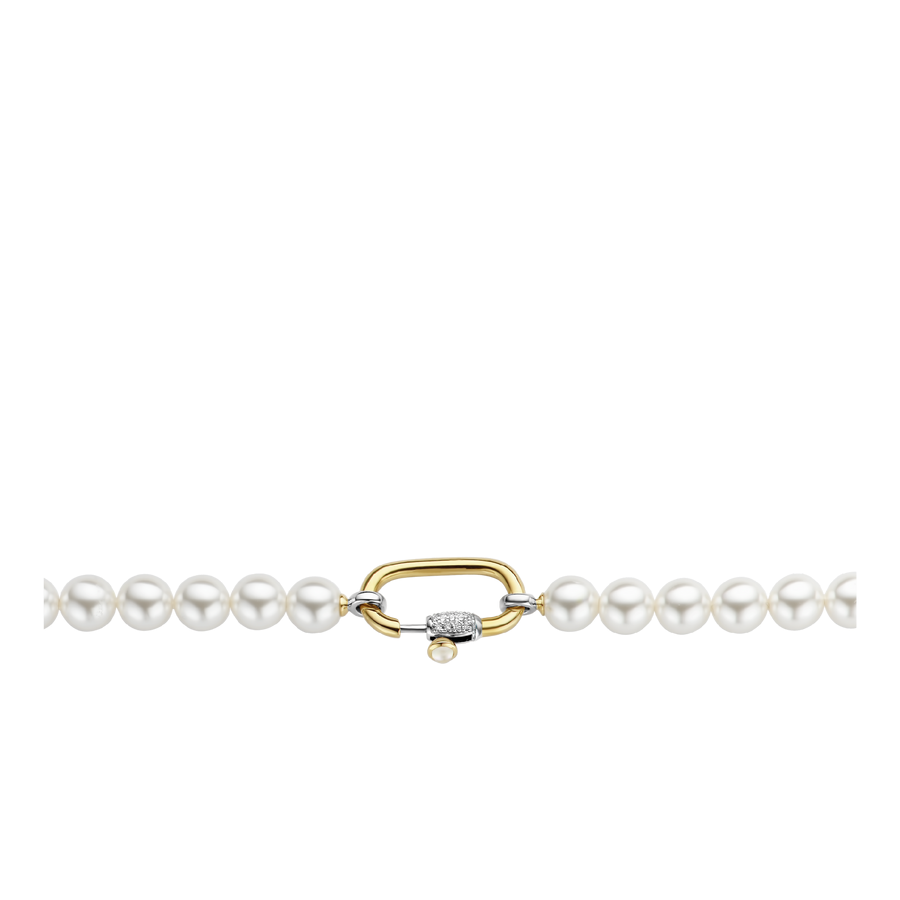 Questa collana in argento placcato oro ha un flusso di perle bianche lucenti tenute insieme da una lussuosa chiusura placcata oro incastonata con pietre di zirconia cubica bianca.