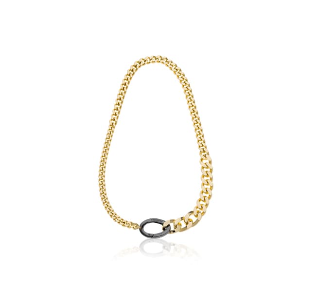 Diamond-cut groumette chain necklace with gold plating and a bronze lobster clasp plated in black ruthenium. Unoaerre reinterprets the beloved classic diamond-cut groumette chain in a contemporary key and incorporates a ruthenium jewelry clasp to be worn visibly for a distinctly rock-inspired touch to your style.