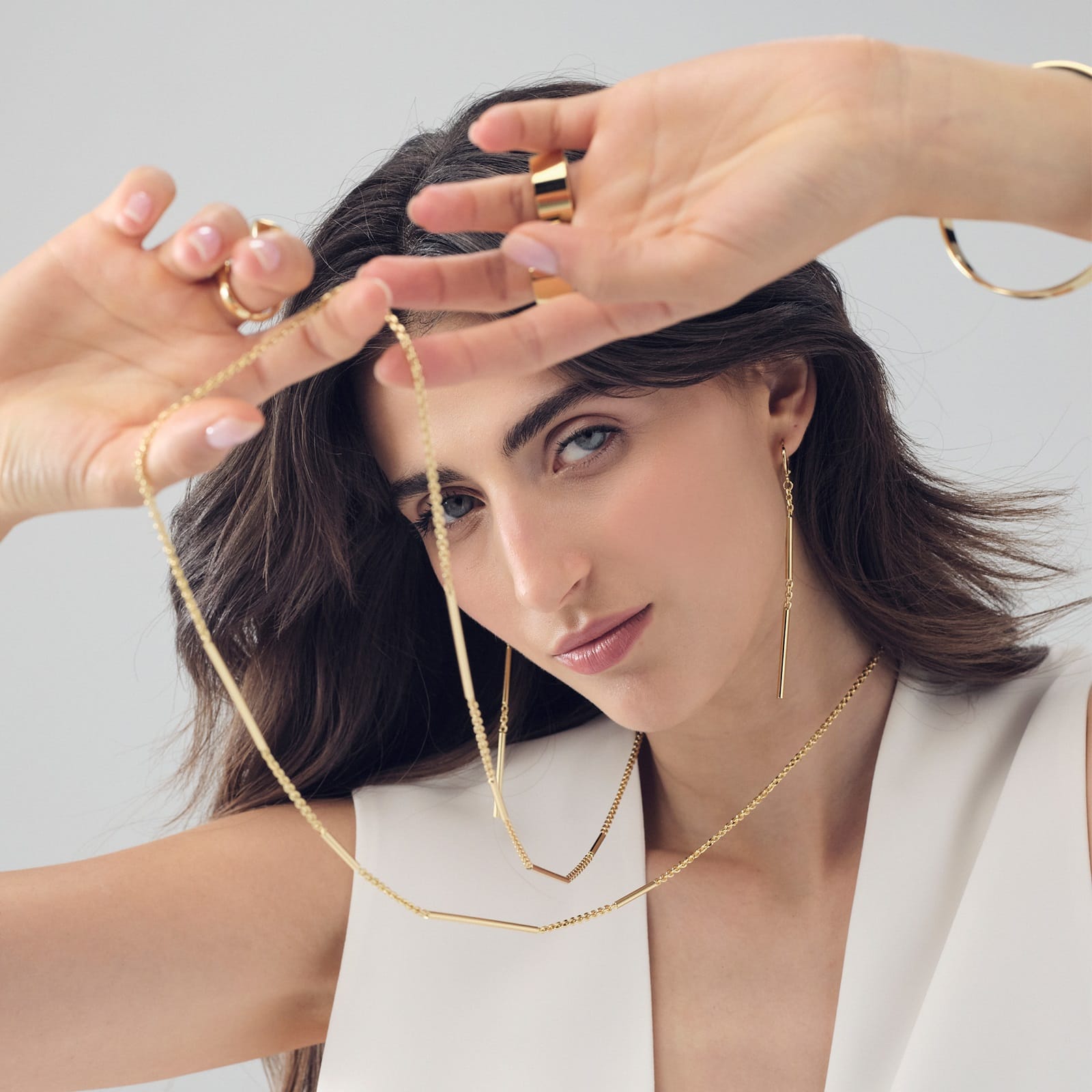 Long earrings with chain and tubular bars. The classic chain element alternates with tubular bars for a clean and essential design ensemble. A refined play of contrasts between soft curves and rigid elements, between tradition and innovation where the jewelry becomes a key expression of oneself and one’s style.