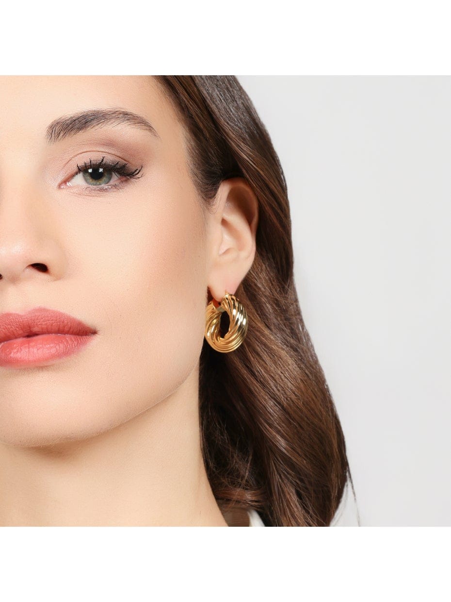 Golden hoop earrings featuring a twisted torchon tube design. Bayonet closure, 2.50 cm diameter. Classic Collection. A timeless piece that combines classic elegance with modern and alluring details.