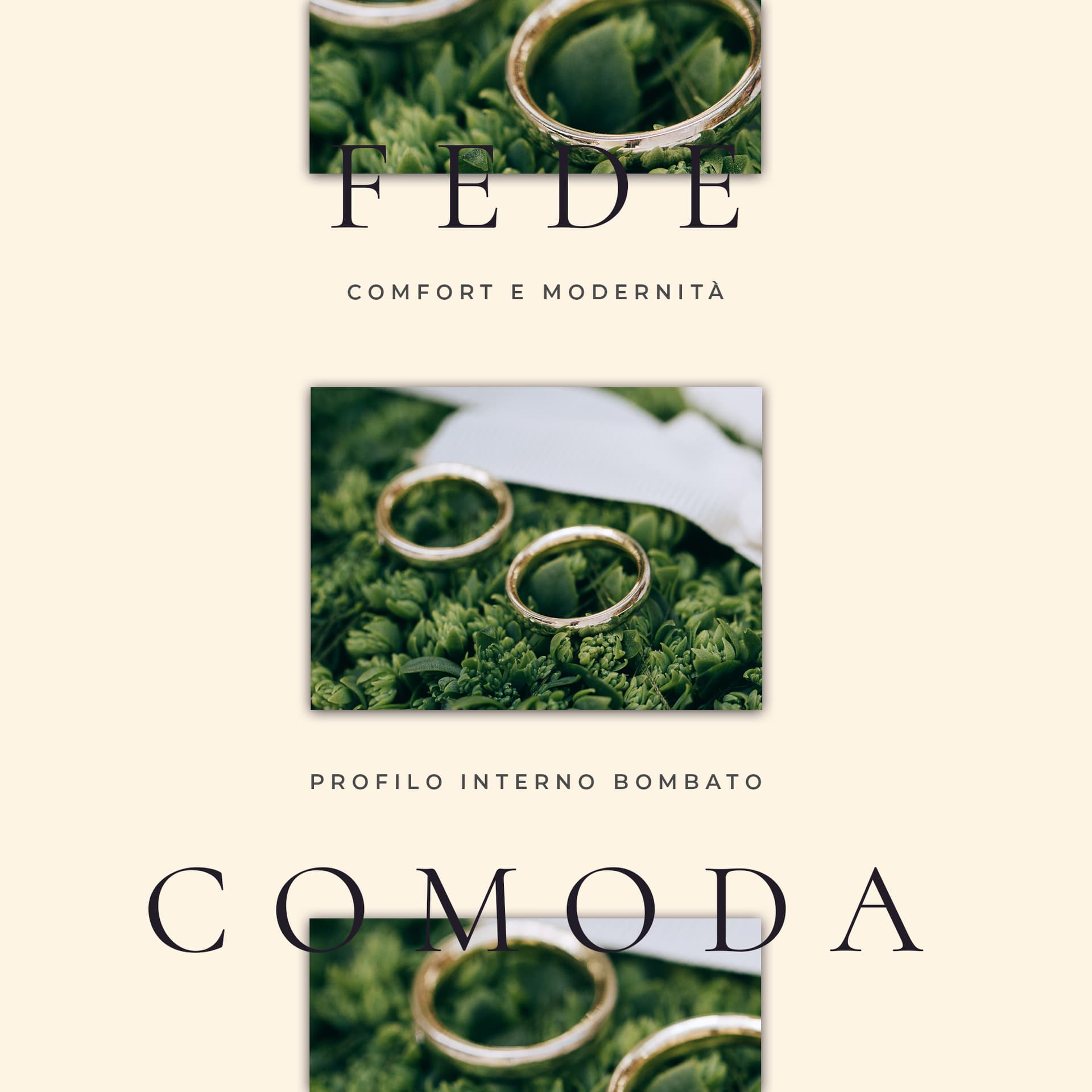 Le fedi comode, dette anche fedi comfort fit, sono una versione moderna e più ergonomica della fede classica. La loro caratteristica principale è la bombatura anche all’interno dell’anello, che permette una calzata più morbida e naturale.