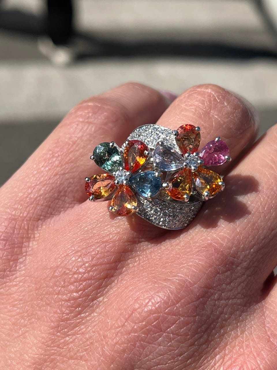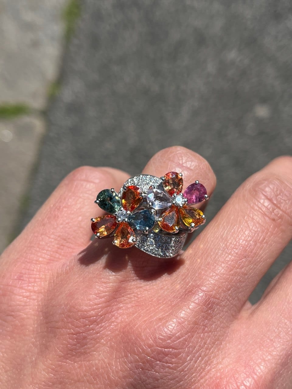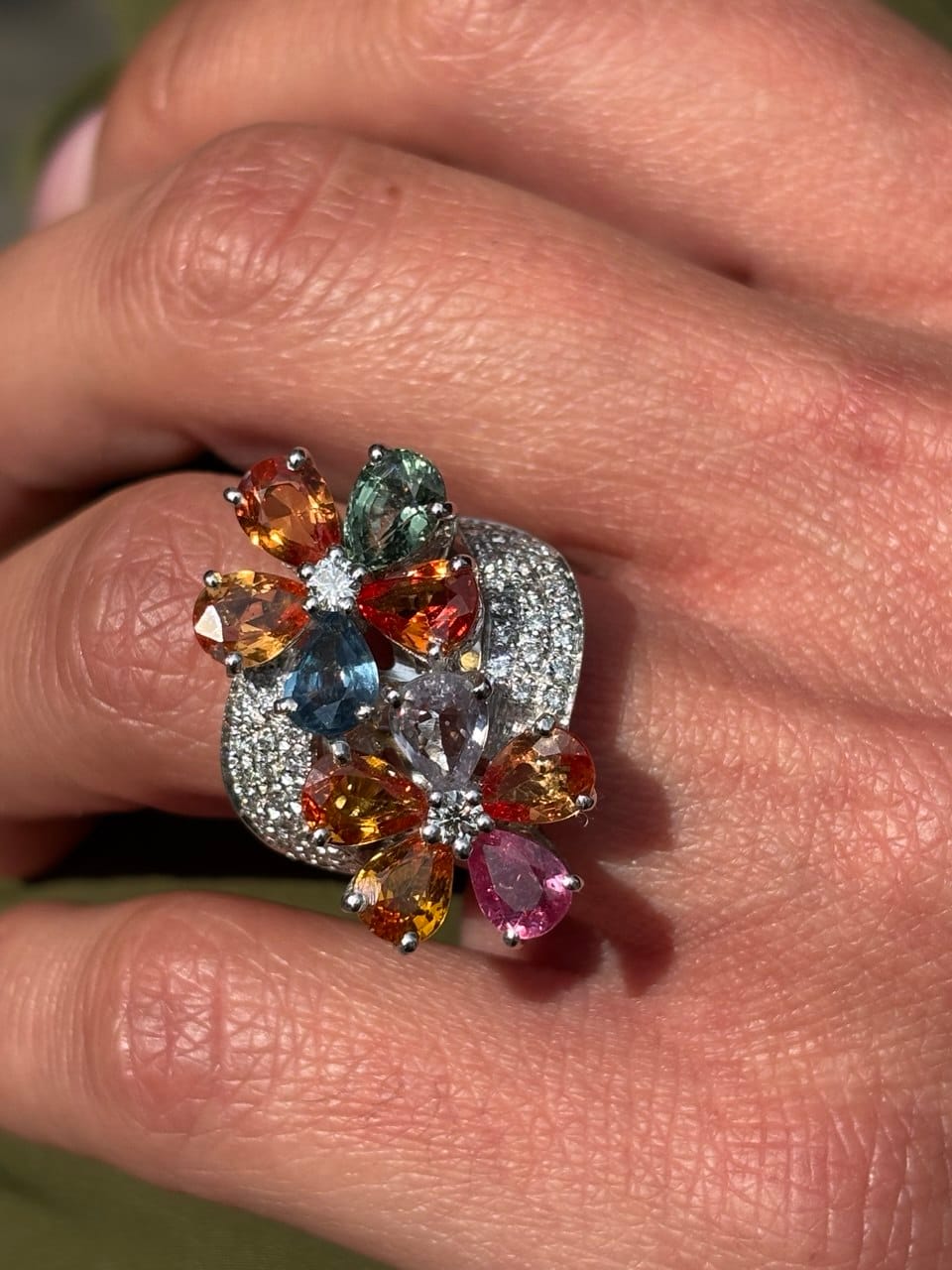 Anello in oro bianco 18 kt con diamanti e zaffiri color