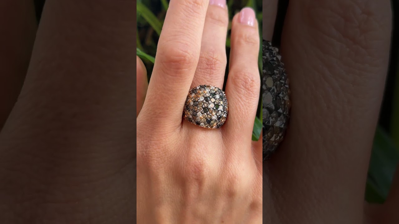 Anello pavé impreziosito da diamanti brown e black. Montatura in oro giallo 18 carati con diamanti incastonati che creano tonailtà calde con effetto scintillante continuo a valorizzare l'intero profilo dell'anello.