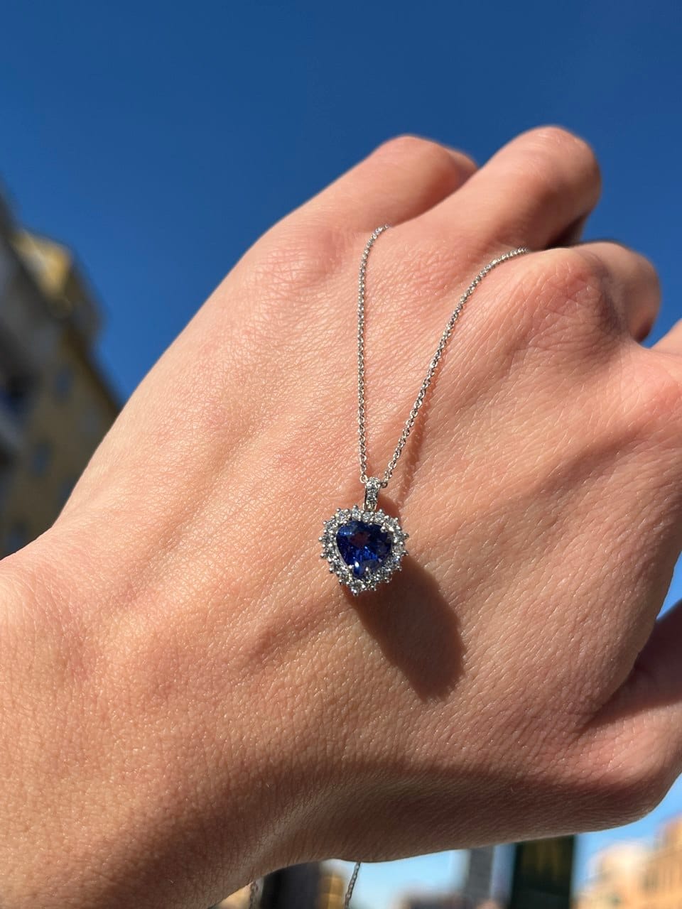Collana in Oro Bianco con ciondolo a cuore con Tanzanite e Diamanti