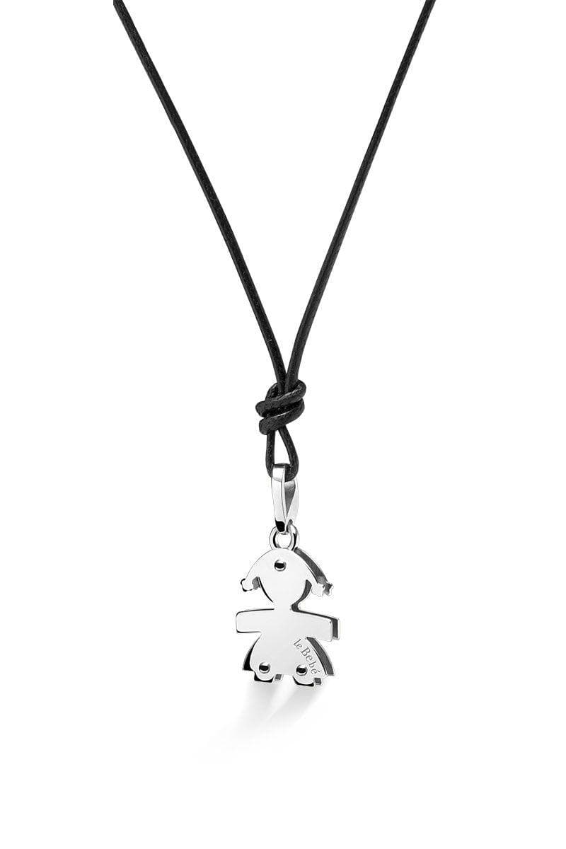 Ciondolo sagoma bimba in oro bianco 9kt con cuore in pavé di diamanti 0,03 ct, su cordino ecologico nero.