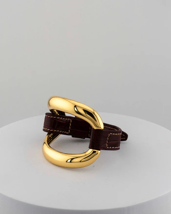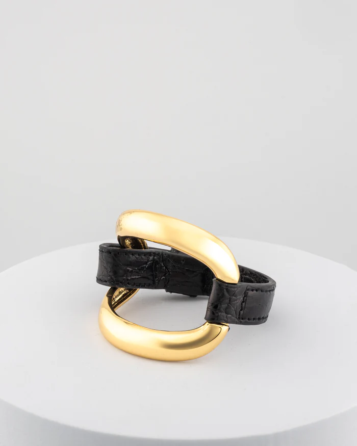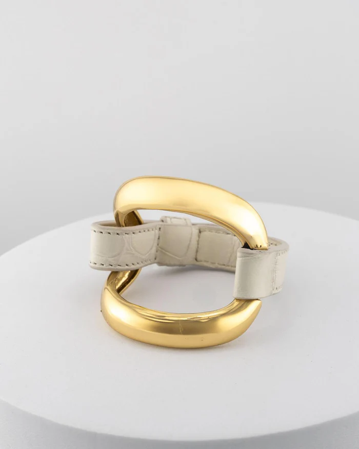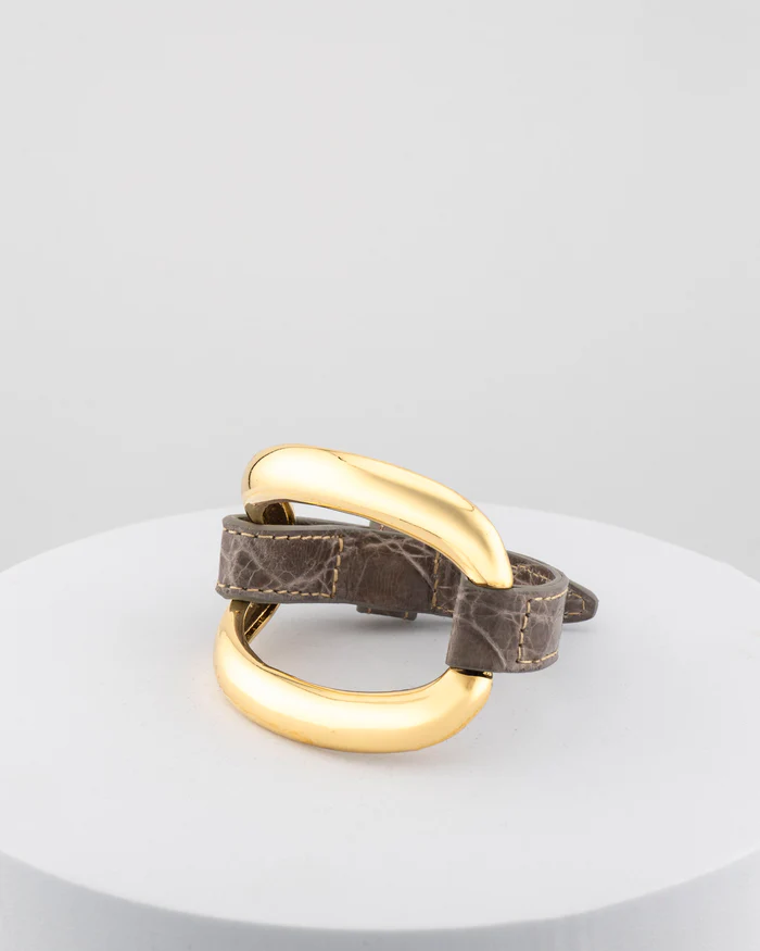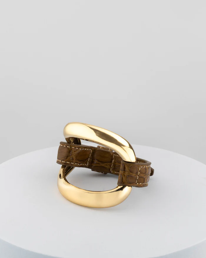 Il bracciale Alligator di MarriCortona è un'opera d'arte artigianale realizzata con grande cura e attenzione ai dettagli. La sua forma ovale e rigida conferisce un'eleganza senza tempo, mentre la microfusione di bronzo placcato in oro 18 carati dona un luccichio dorato che cattura la luce naturale in modo spettacolare. Una delle caratteristiche distintive di questo bracciale è l'utilizzo della pelle di vero coccodrillo. Realizzato in Toscana.