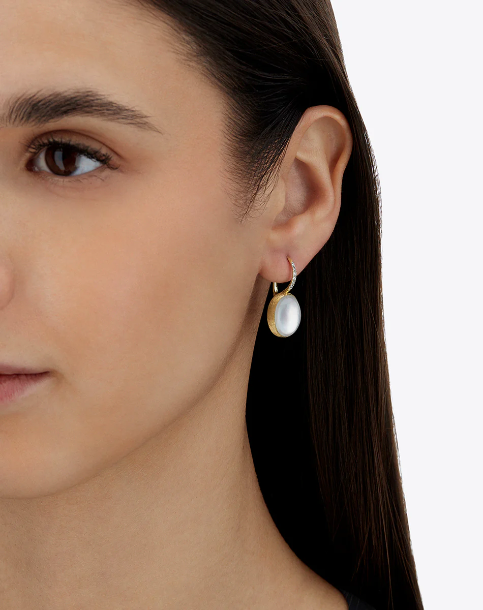 Una notte d’estate, la brezza sulla pelle, il cielo che si veste di luce lunare. Nella nuance Dolcevita, la madreperla incontra la Boule — forma iconica di Nanis — in un gioco di riflessi cangianti che ne esalta la lucentezza. Gli orecchini Ciliegine, in oro 18kt inciso a mano, accolgono cristallo di rocca e madreperla in un abbraccio armonioso, celebrando l’eleganza senza tempo e la bellezza della materia. La chiusura con diamanti aggiunge luce, mentre le diverse dimensioni e modelli permettono mix unici. Ogni combinazione è un gesto personale, che racconta lo stile con naturalezza.