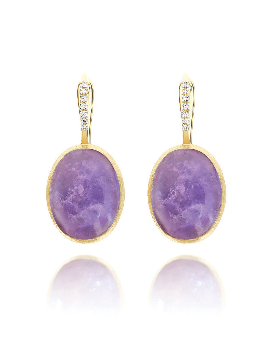 Nanis - Orecchini ciliegine Violetta"BOULES" in oro inciso, diamanti, lepidulite e madreperla (GRANDI)