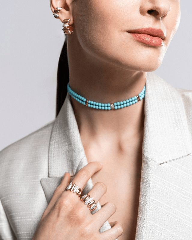 I gioielli si ispirano a forme morbide, impreziositi da dettagli unici come perle luminose e pietre turchesi, che regalano tocchi di colore e vitalità.
