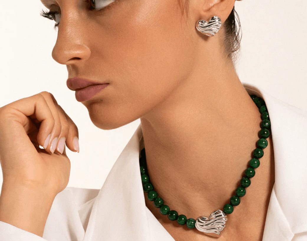 Il Girocollo Cuore Bold con Pietre di Giada Verde Scuro unisce energia e armonia in un design intriso di eleganza contemporanea.