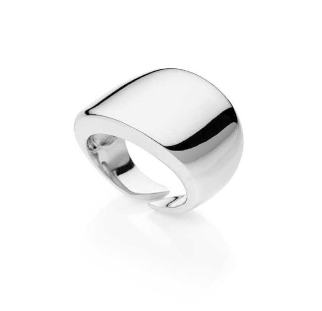 Anello aperto a fascia bombata in bronzo con bagno in argento 925. Un accessorio dalla visibilità importante e dalle linee scultoree perfetta sintesi dell'idea di gioiello contemporaneo secondo UNOAERRE.