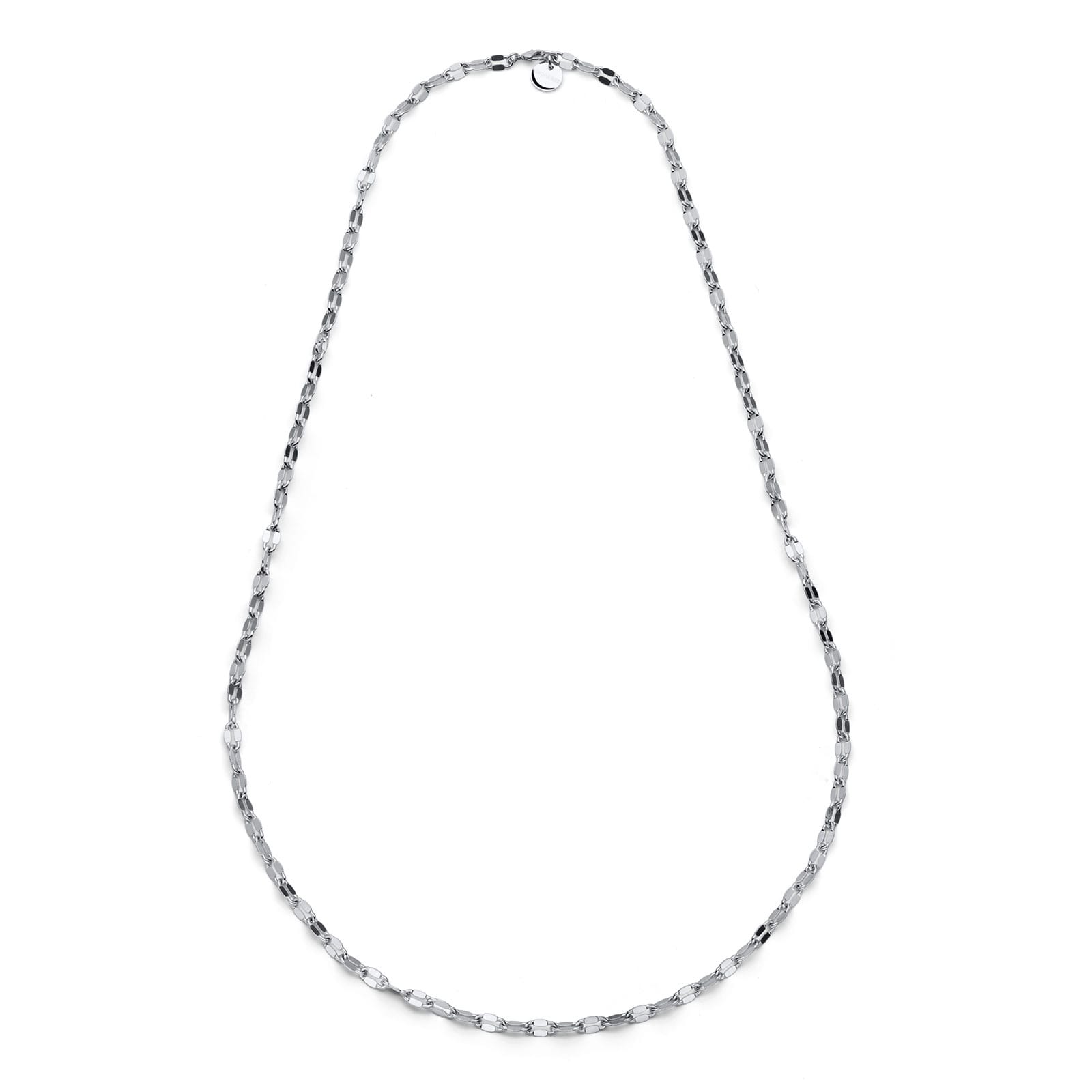 Collana lunga in maglia marina piatta, finitura lucida argento. L'iconica maglia marina viene declinata in versione piatta per un finish ancor più luminoso e contemporaneo. Unoaerre rende omaggio alla storica produzione catene rivisitando in chiave attuale alcuni iconici capisaldi dell'oreficeria