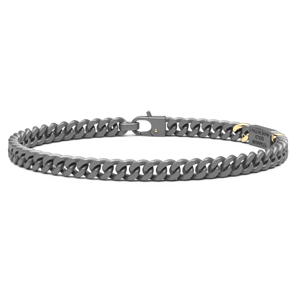 Il design della catena alterna elementi in titanio e maglie in oro, creando un contrasto elegante e distintivo.